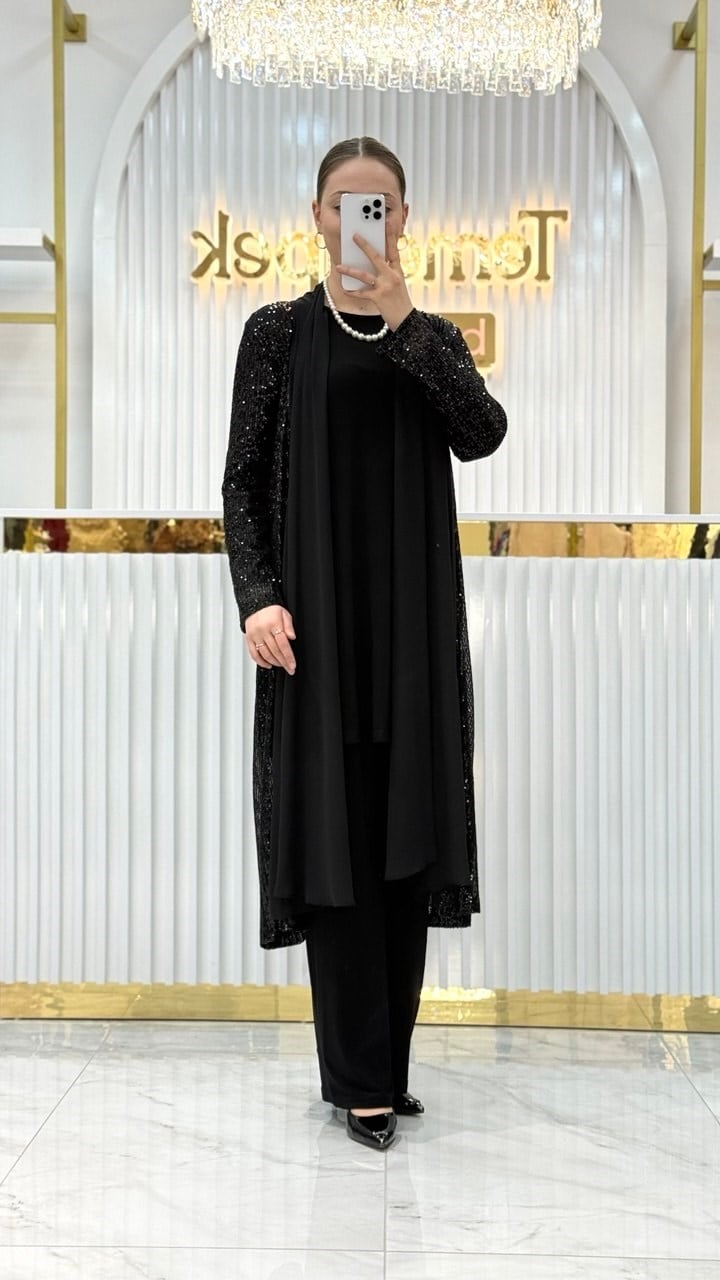 Işıltılı pul payet detaylarıyla tasarlanan üçlü takım modelleri, özel günlerde şıklığı ve modern tarzı bir arada sunar.