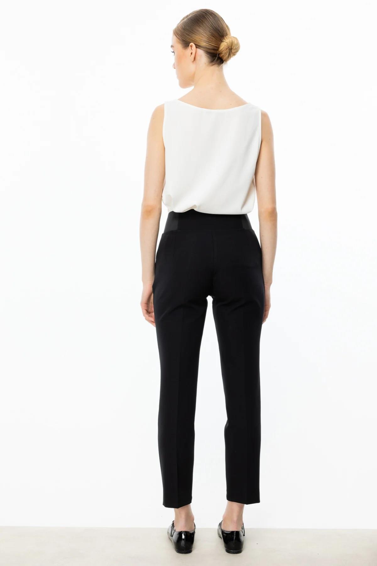 Ürün Özellikleri:Yüksek bel, dar paça, beli kalın lastikli, çift düğmeli, cepsiz Ürün Kalıbı: Tam Kalıp Ürün Kalınlığı: İnce Ürün Boyu: 95 cm Kumaş İçeriği: %92 polyester %8 likra Ürün Sezonu: İlkbahar/Yaz Manken Ölçüleri: 1.76cm 84/61/89 Numune Beden: Ürünün en küçük bedenidir.