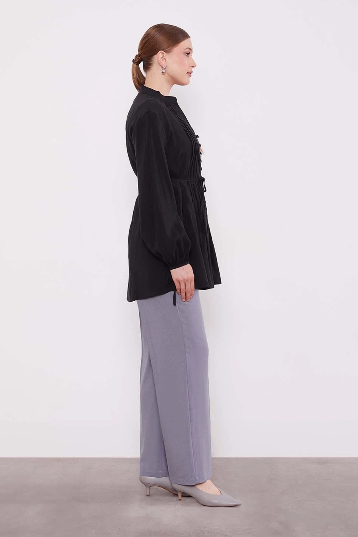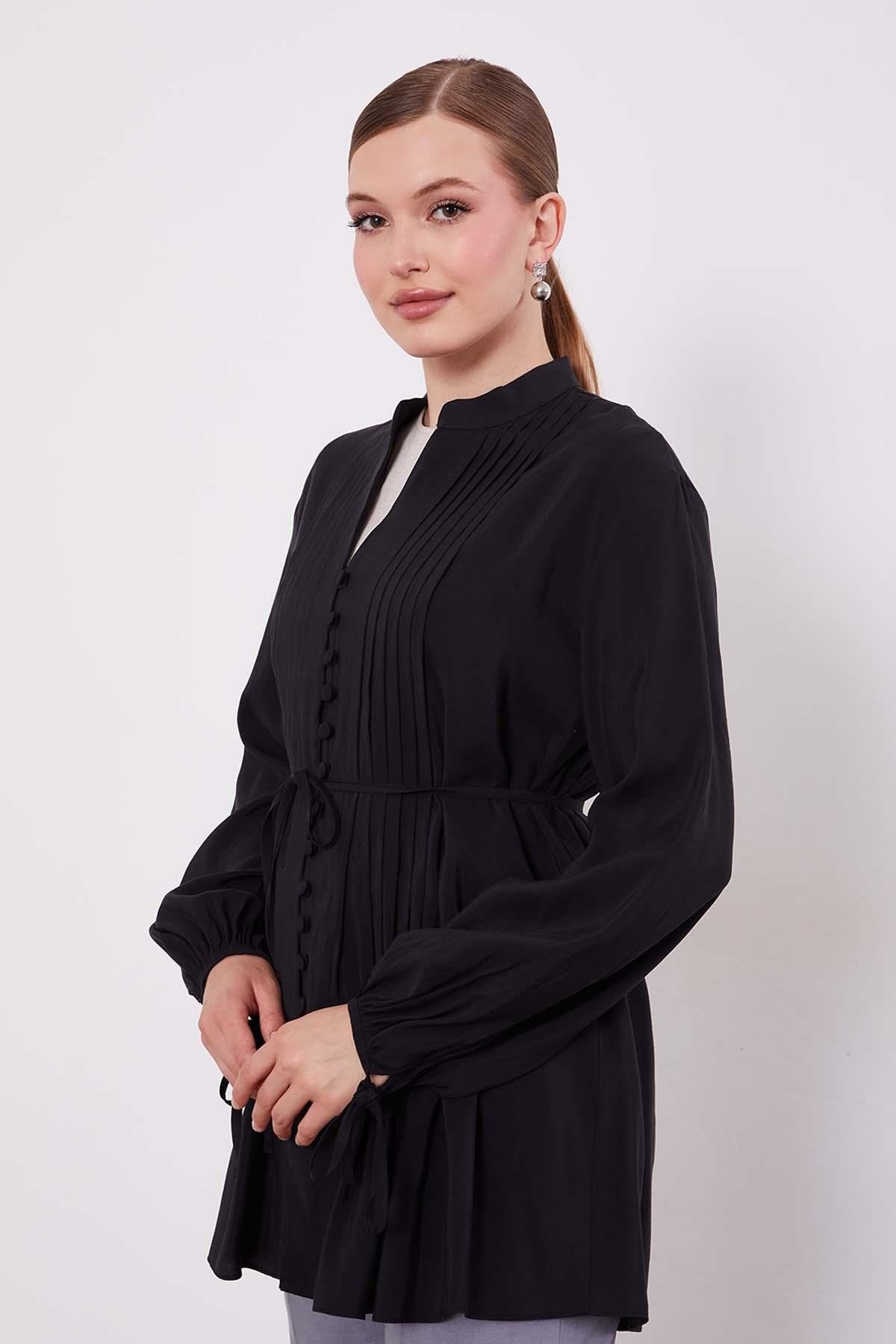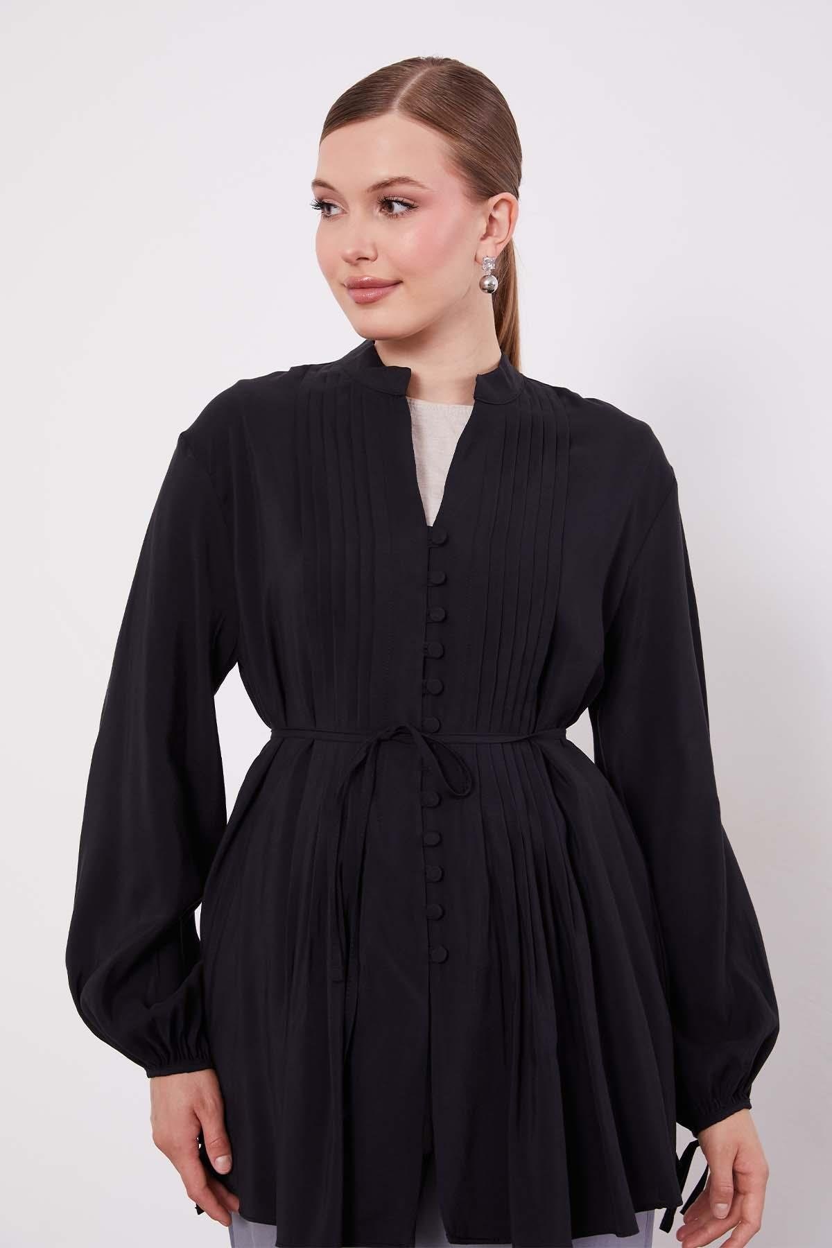 Pamuk vual kumaşıyla üzerinizde yok hissi veren düğme detay belden bağlama gömlek aynı anda hem güçlü hem de zarif bir siluet sunuyor. Günlük koşturmanızda nefes alan pamuk kumaşı sayesinde gün boyu konfor sağlıyor. Omuzdan başlayan pileli dikişleri ve dökümlü formu ile zarafet ve şıklık kazandırıyor. Gömleğin ön kısmında yer alan düğme detayları klasik şıklığı vurgularken; belden bağlama özelliği sayesinde vücuda oturarak kombinlerinizi güçlü kılıyor.